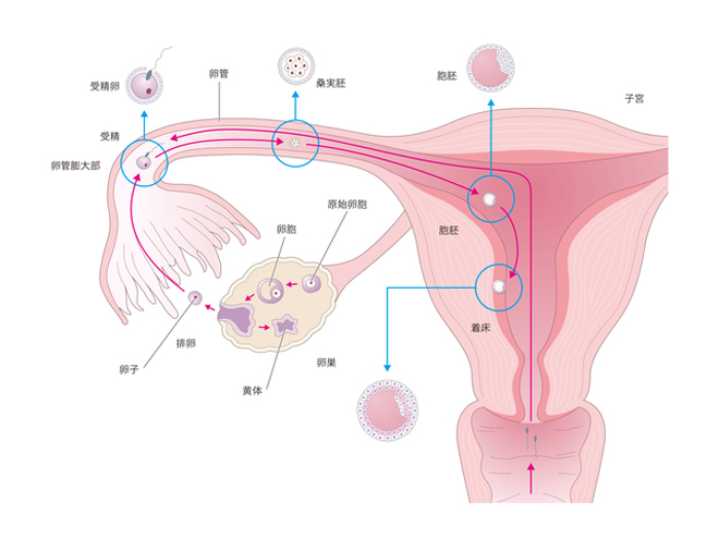 卵巣から飛び出した「卵子」が、卵管の中で「精子」と出会い「受精卵」となり、細胞分裂を繰り返しながら子宮に辿り着くころに「胞胚」となって、子宮内膜に潜り込んで「着床」した状態が