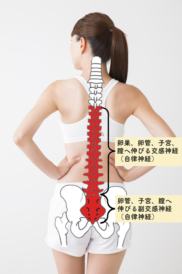 妊娠に直接関係する卵巣、卵管、子宮、膣の働きをコントロールする自律神経が、背骨の上部(第5胸椎)から骨盤(仙骨5番)までの間から卵巣、卵管、子宮、膣につながっています。