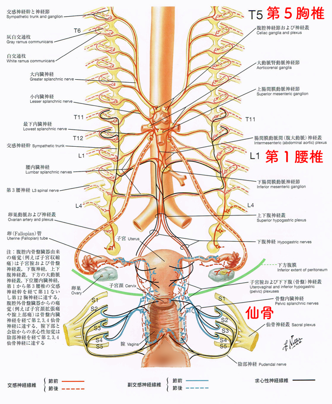 こちらの画像は、女性の生殖器をコントロールする自律神経の支配図です。