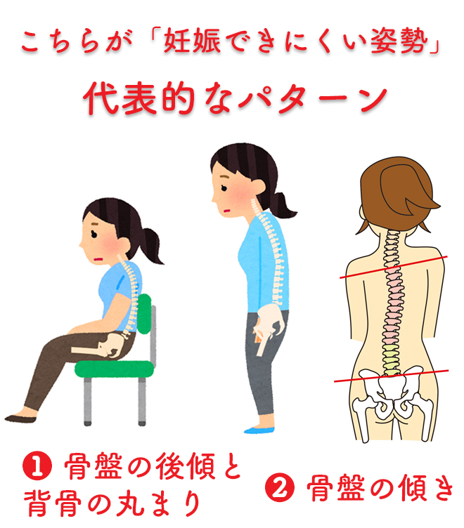 更に、骨盤の後傾、背中が丸くなることで、内臓が圧迫され、卵巣、卵管、子宮も圧迫され強いストレスを受けることでその機能が低下して妊娠できにくくなります。