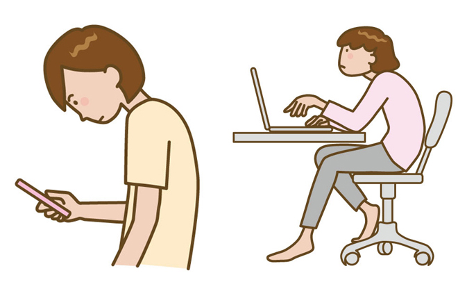 パソコン・スマホの普及、体操座り、横座り、フローリングでの床生活で、無意識に骨盤が後傾し、背中が丸まります。