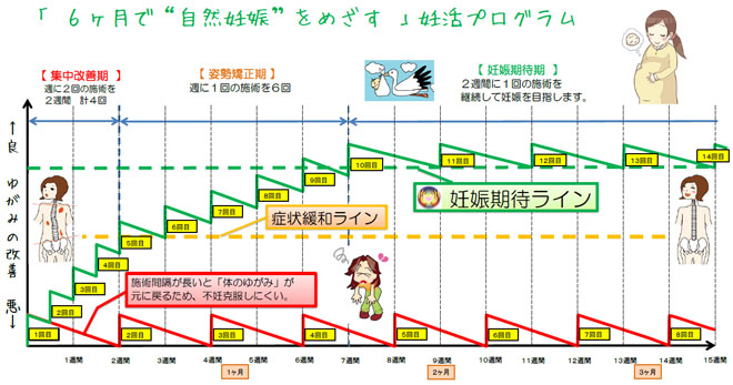 集中改善期間により、ゆがみ・症状が改善した状態から、妊娠が期待出来るレベルまで骨盤や体のゆがみを改善していきます。